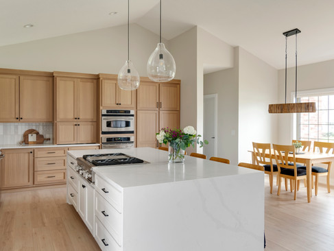 We chose quarter-sawn white oak cabinetry with a custom SW stain finish throughout the kitchen mixed with white cabinetry for the island. Also, the design included new flooring to lighten the space and move away from the maple. By taking away the hood from the middle of the kitchen and updating the island, we were also able to add in gorgeous pendant lights to center the space.